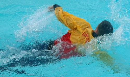 The second arm then pulls down with the arm to the side of the body, and the head will move back facing the bottom of the pool, enabling the body to stay horizontal in the water.